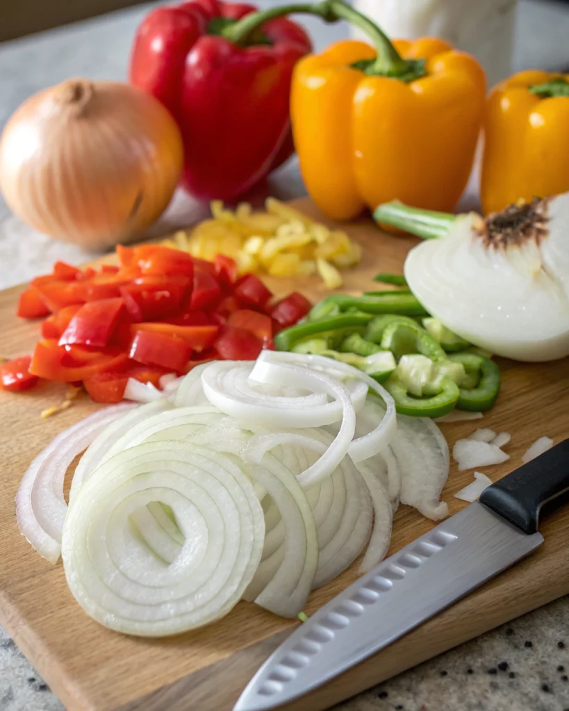 - Préparer les légumes Émincez les oignons et les poivrons en lanières épaisses. Ils doivent rester légèrement croquants.